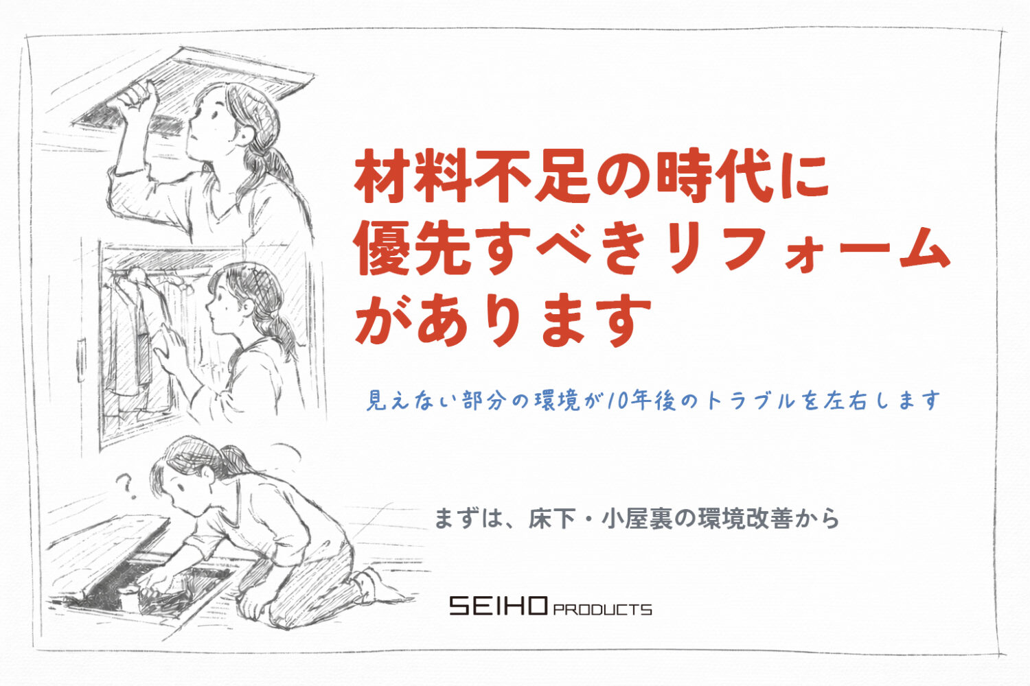 日本の住環境には、普段は目に見えない場所・現象で進行する「建物寿命に直結するリスク」があります。セイホープロダクツは、その技術力で生活の質をお守りするお手伝いをしております。