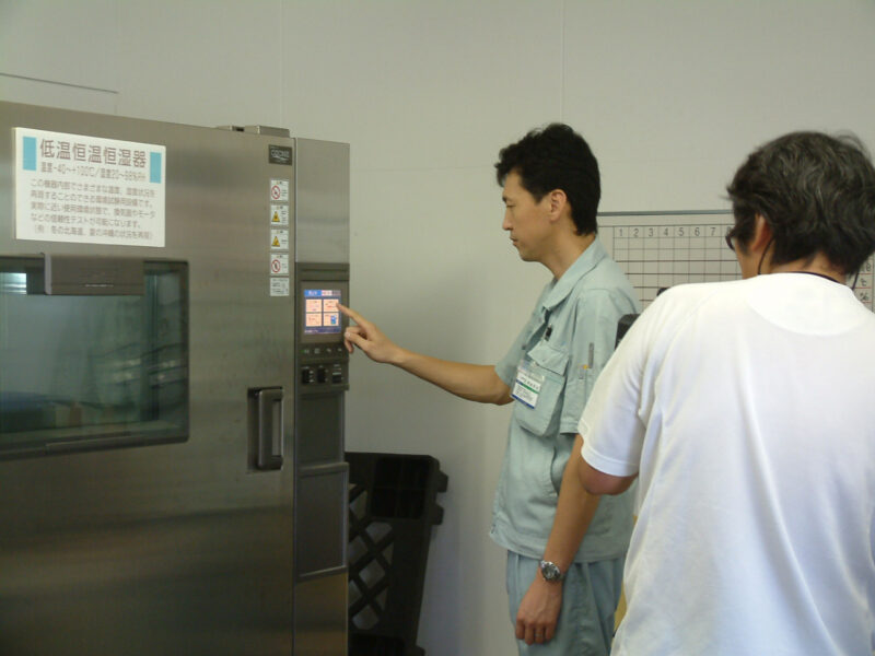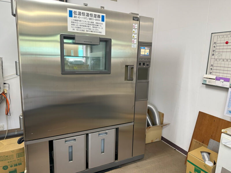 この「低温恒温恒湿器」は機器内部でさまざまな温度、湿度状況(温度-40~+100℃/湿度20~98%RH)を再現することのできる環境試験用設備です。