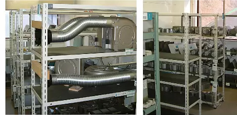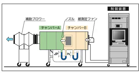 ダブルチャンバー方式を採用した風量測定機で精度が高く、JISやISO,AMCA等の規格に基づいて製作された装置です。